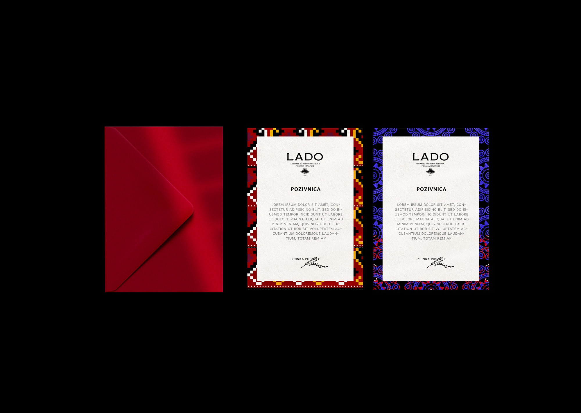 We began at the source: Lado’s archives and stage performances - the artistic core of the ensemble. We studied costumes, textures, patterns, and motifs that reflect the richness of Croatian cultural heritage. Instead of imitating folklore, we translated it into a contemporary visual language suitable for the stage, concerts, and digital environments. The focus was on a harmonious blend of spectacle, tradition, and modernity. Together with the client, we defined the brand’s key values: character, positioning, style, energy, and legacy - guiding every design decision.