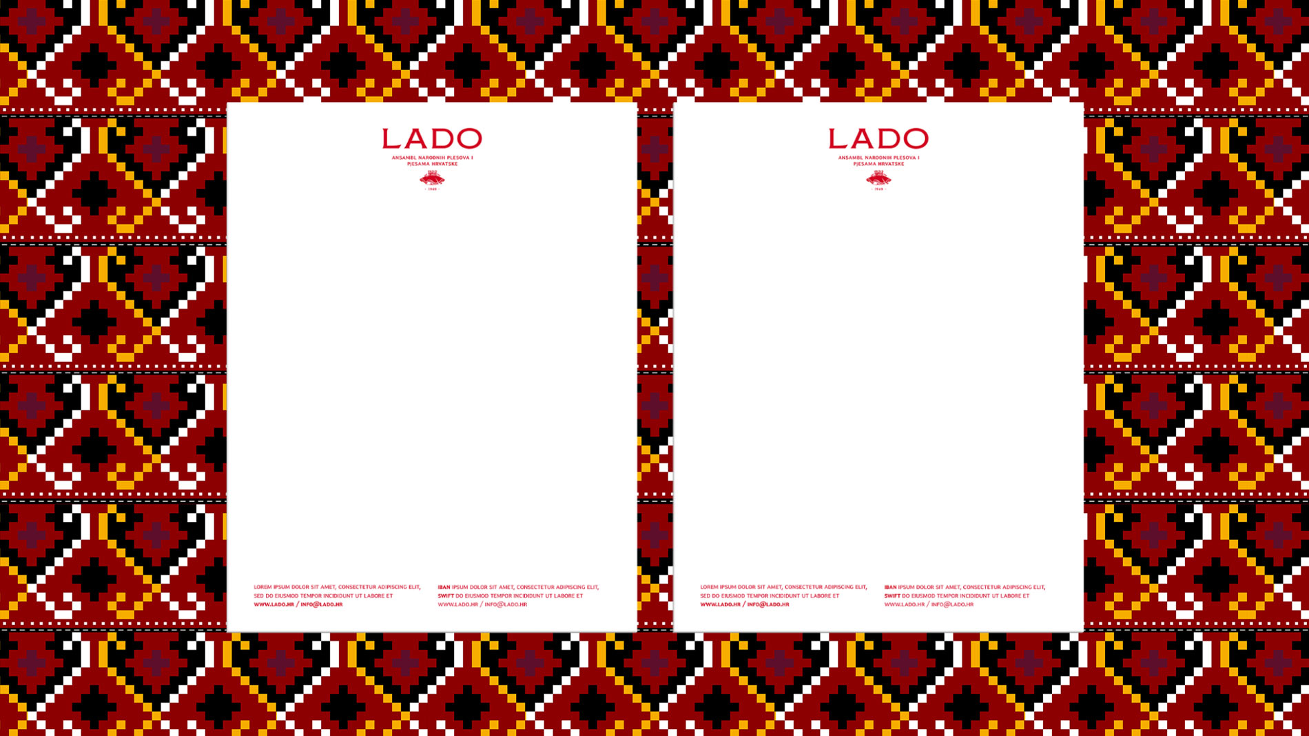 The design process involved a comprehensive modernization of Lado’s visual identity while honoring the artistic essence that has shaped the ensemble for more than seventy years. The redesign of the logotype was the starting point. The iconic motif of six dancers from the choreography “Posavski plesovi” remained central to the identity, refined and balanced for contemporary communication. Originally created in 1950, the emblem was redrawn with precise lines and stable proportions for clarity and adaptability across brand formats - from stage projections to digital media.